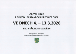 Obecní úřad oznamuje, že v období od 4. do 13. března 2026 bude uzavřen pro veřejnost z důvodu čerpání OČR.