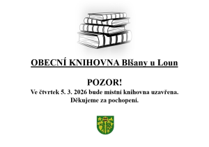 Ve čtvrtek 5. března 2026 bude místní knihovna v Blšanech u Loun uzavřena.