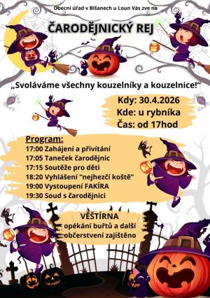 Zveme všechny kouzelníky a kouzelnice na Čarodějnický rej, který se koná 30. dubna 2026 u rybníka.