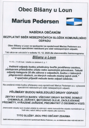 Obec Blšany u Loun zajišťuje bezplatný sběr nebezpečného odpadu ve spolupráci se společností Marius Pedersen a. s.