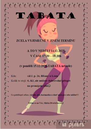 POZOR ZMĚNA! TABATA bude probíhat tento týden v neděli 14.12.2025 v čase od 17:30 - 18:30 hod. V pondělí 15.12.2025 cvičení nebude.