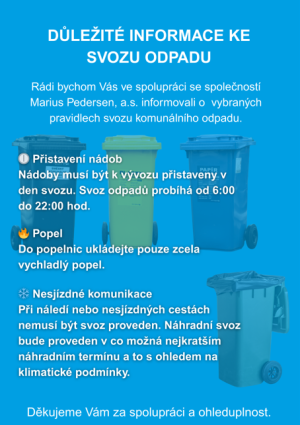 Rádi bychom Vás ve spolupráci se společností Marius Pedersen, a.s. informovali o vybraných pravidlech svozu komunálního odpadu. Děkujeme Vám za spolupráci a ohleduplnost.