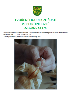 Místní knihovna Blšany u Loun Vás srdečně zve na tvoření figurek ze šustí, které se koná ve čtvrtek 22.1.2026 v čase 17:00 - 19:00.
