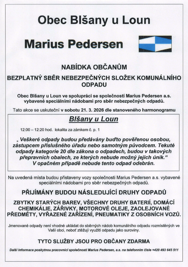 Obec Blšany u Loun ve spolupráci se společností Marius Pedersen a.s. pořádá akci na bezplatný sběr nebezpečných složek komunálního odpadu.