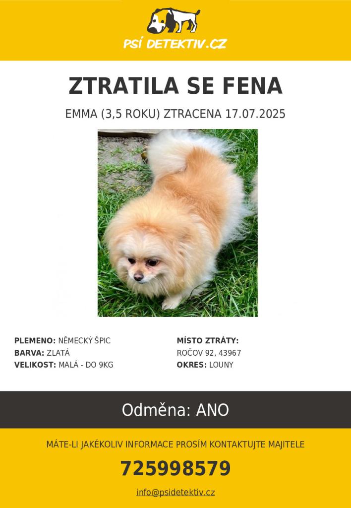 Fena Emma, 3,5 roku stará, byla naposledy viděna 17. července 2025 v Ročově, okres Louny. Je zlaté barvy a váží do 9 kg. Majitelé se obracejí na veřejnost s prosbou o pomoc a vyhlašují odměnu za jakékoliv informace, které by mohly vést k jejímu nalezení. V případě jakýchkoliv informací, prosím, kontaktujte majitele na telefonním čísle 725 998 579 nebo na emailu info@psidetektiv.cz.
